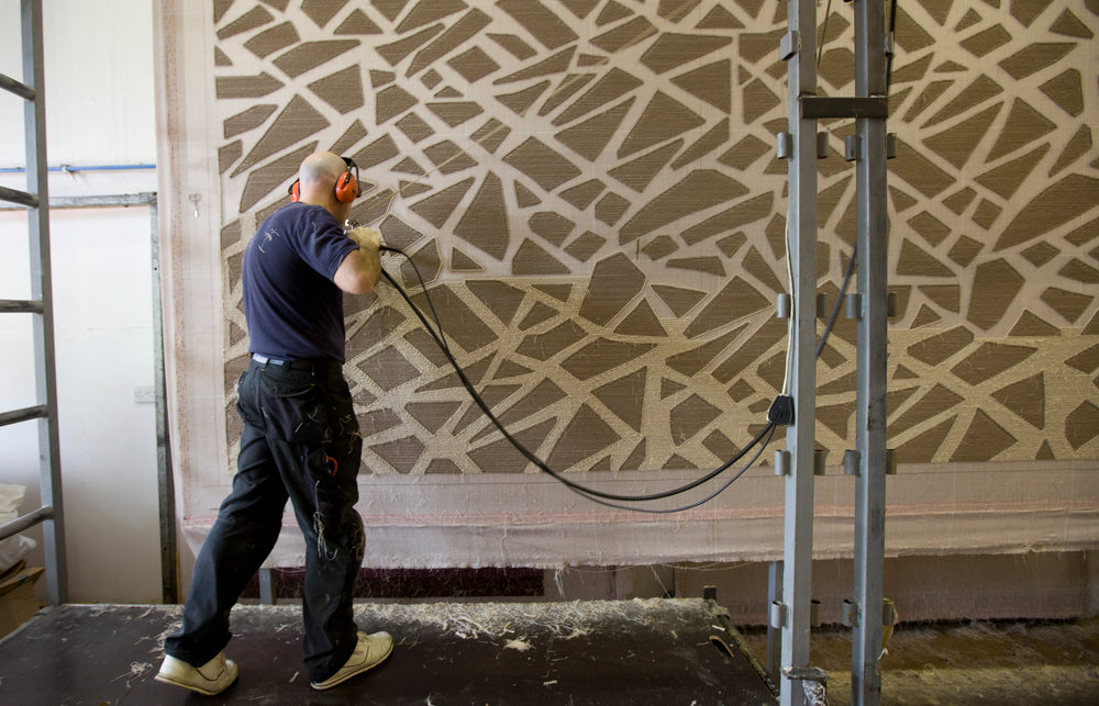 Compressed air pushes the yarn through the canvass. A steady hand, strong arms and years of experience in knowing the speed to tuft gives that final 'must have' feel. The guns can be set to give different pile heights and the shape of the tuft.